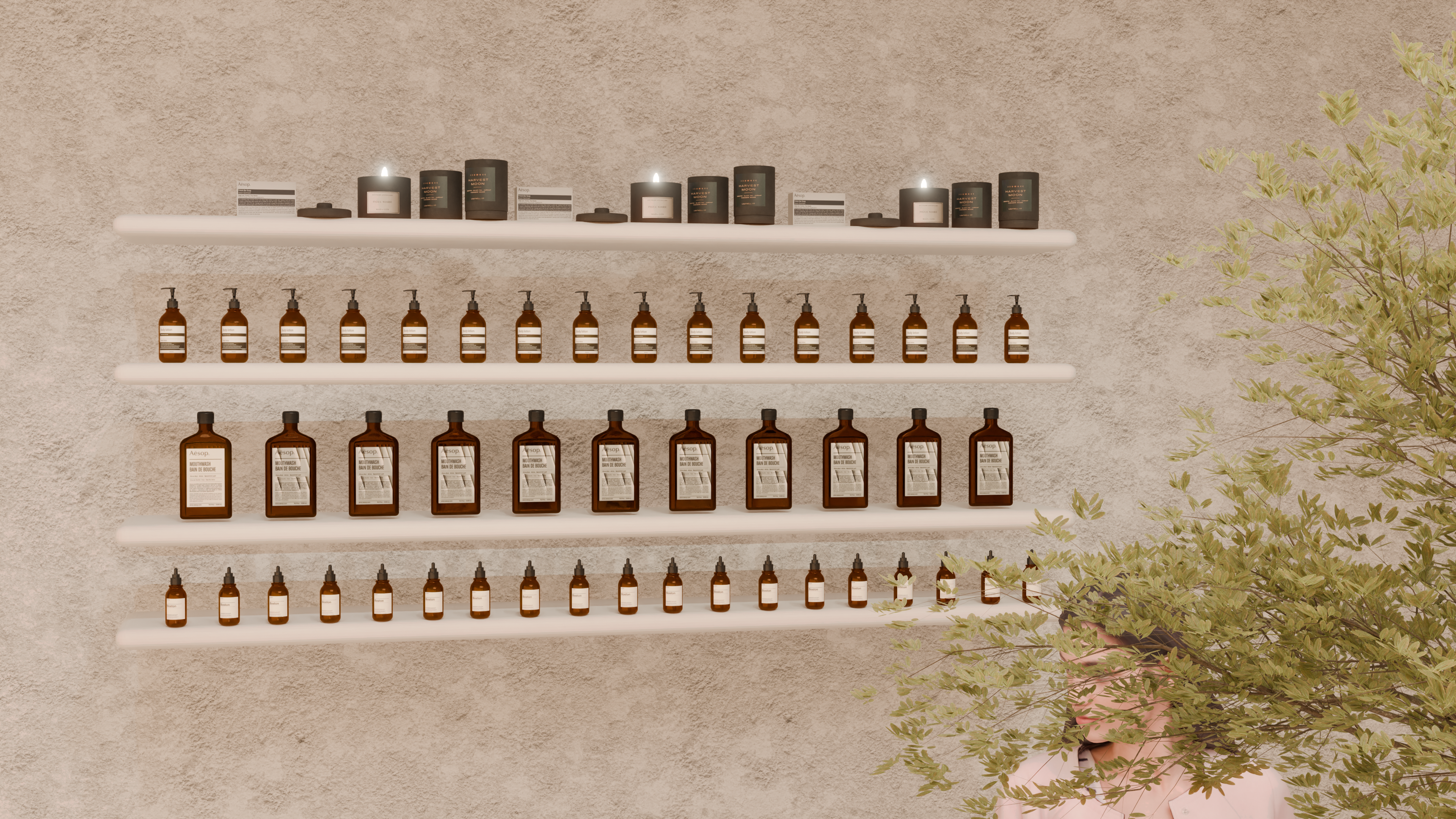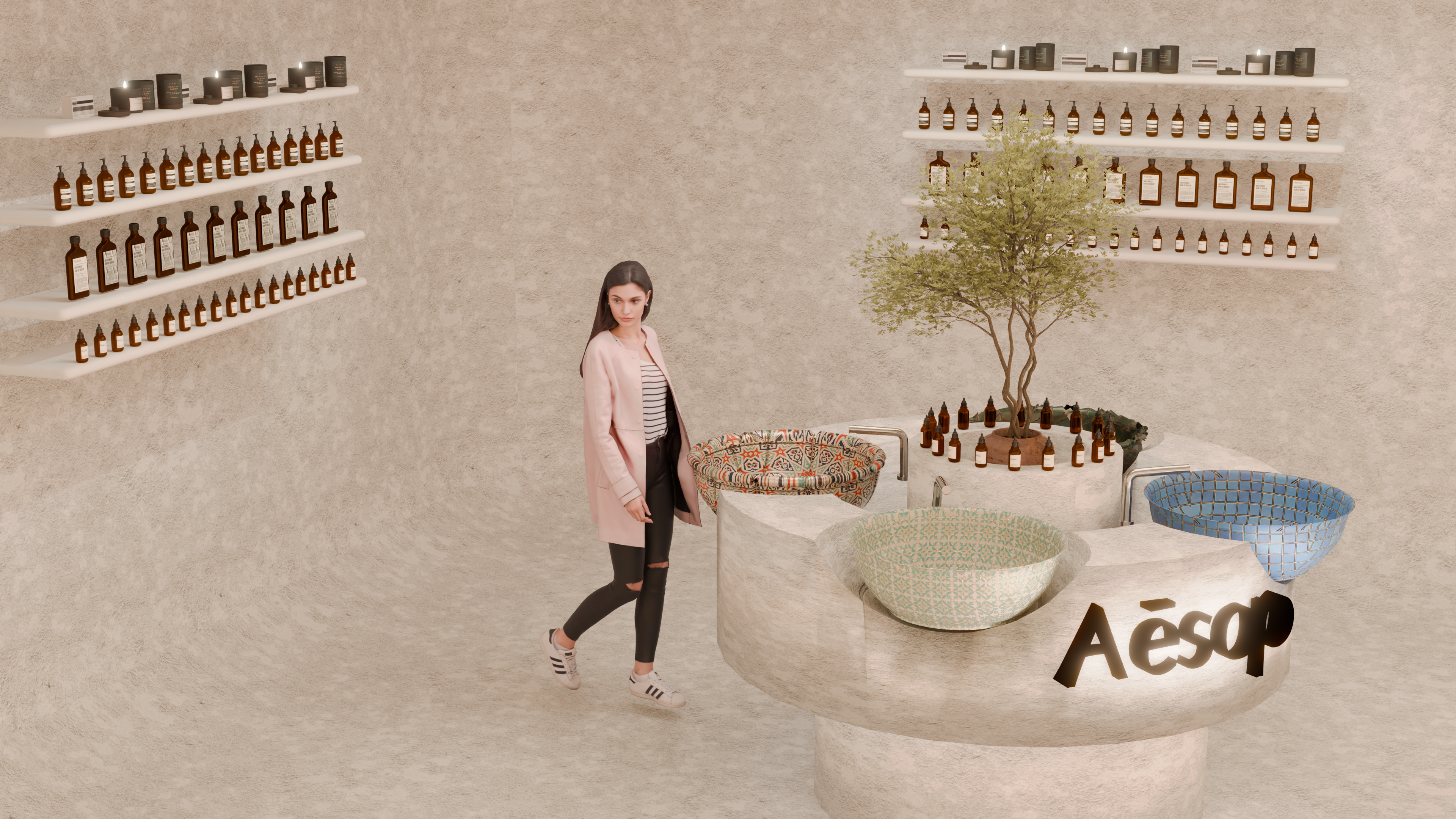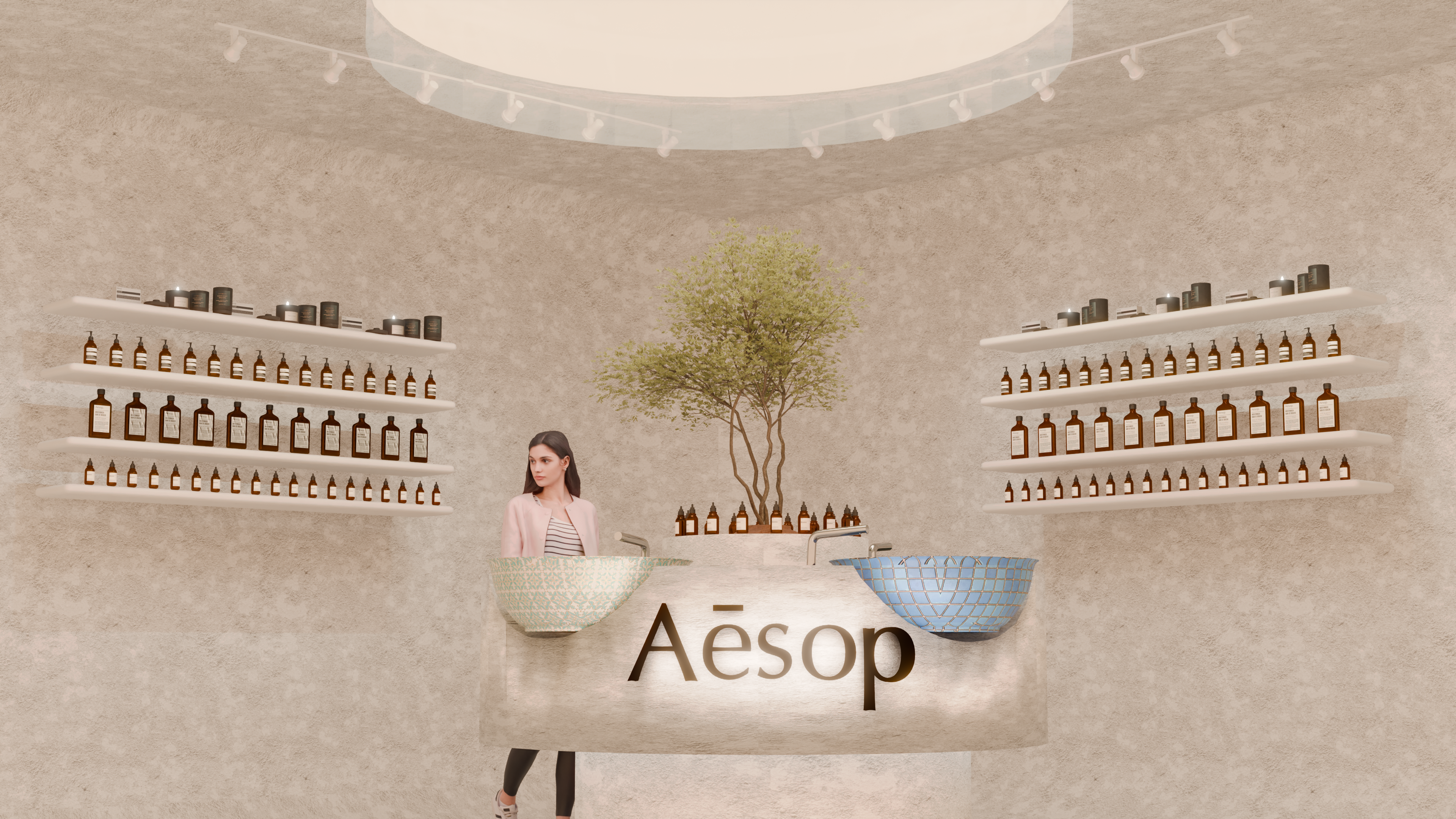This self-initiated concept proposes a 5m x 5m immersive retail pop-up, open on two sides with a 3m height limit. It draws inspiration from Mediterranean life—natural light, botanical elements, and artisanal tiles—imagining a new Aesop product line based on Mediterranean ingredients and rituals.